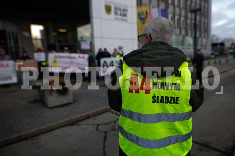 Wroclaw 30.11.2023: We Wroclawiu pod Urzedem Marszalkowskim zorganizowano protes przeciwko przebudowie A4 w starym sladzie. Zgadzaja sie natomiast na przebydowe w "nowym sladzie". Na to nie chce zgodzic sie Urzad Marszalkowski. n/z protest o A4 Fot: Krzysztof Zatycki/Photosello.com
